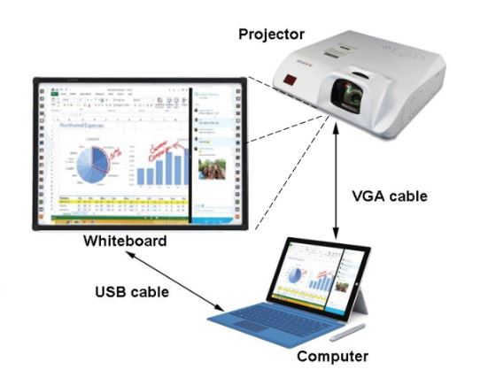Để có thể sử dụng được Bảng tương tác thông minh, bạn cần kết nối đồng bộ giữa máy tính, máy chiếu và bảng tương tác. Máy tính là nguồn cung cấp dữ liệu chính cho công việc của bạn, máy chiếu có tác dụng truyền tải thông tin, dữ liệu từ máy tính lên bảng tương tác. Sự kết hợp giữa 3 thiết bị này hỗ trợ tối đa cho các bài giảng, bài thuyết trình, hội họp của bạn.