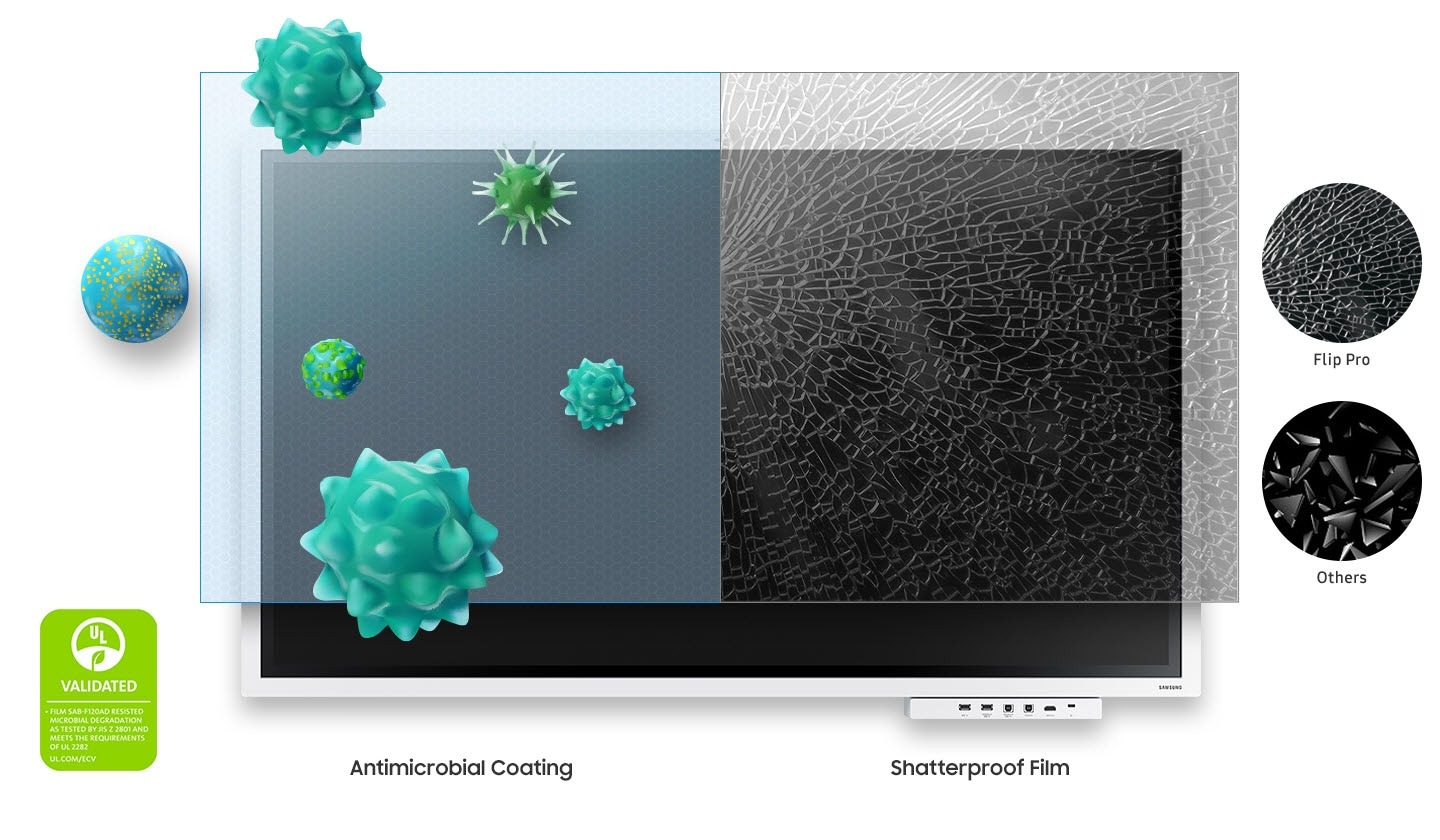 Flip Pro 75 inch còn được trang bị lớp phủ kháng khuẩn, giúp hạn chế sự phát triển của vi sinh vật, đảm bảo an toàn cho người dùng. Màn hình cũng được bọc bởi lớp phim chống vỡ đặc biệt, giúp duy trì độ bền cao ngay cả khi xảy ra va đập.