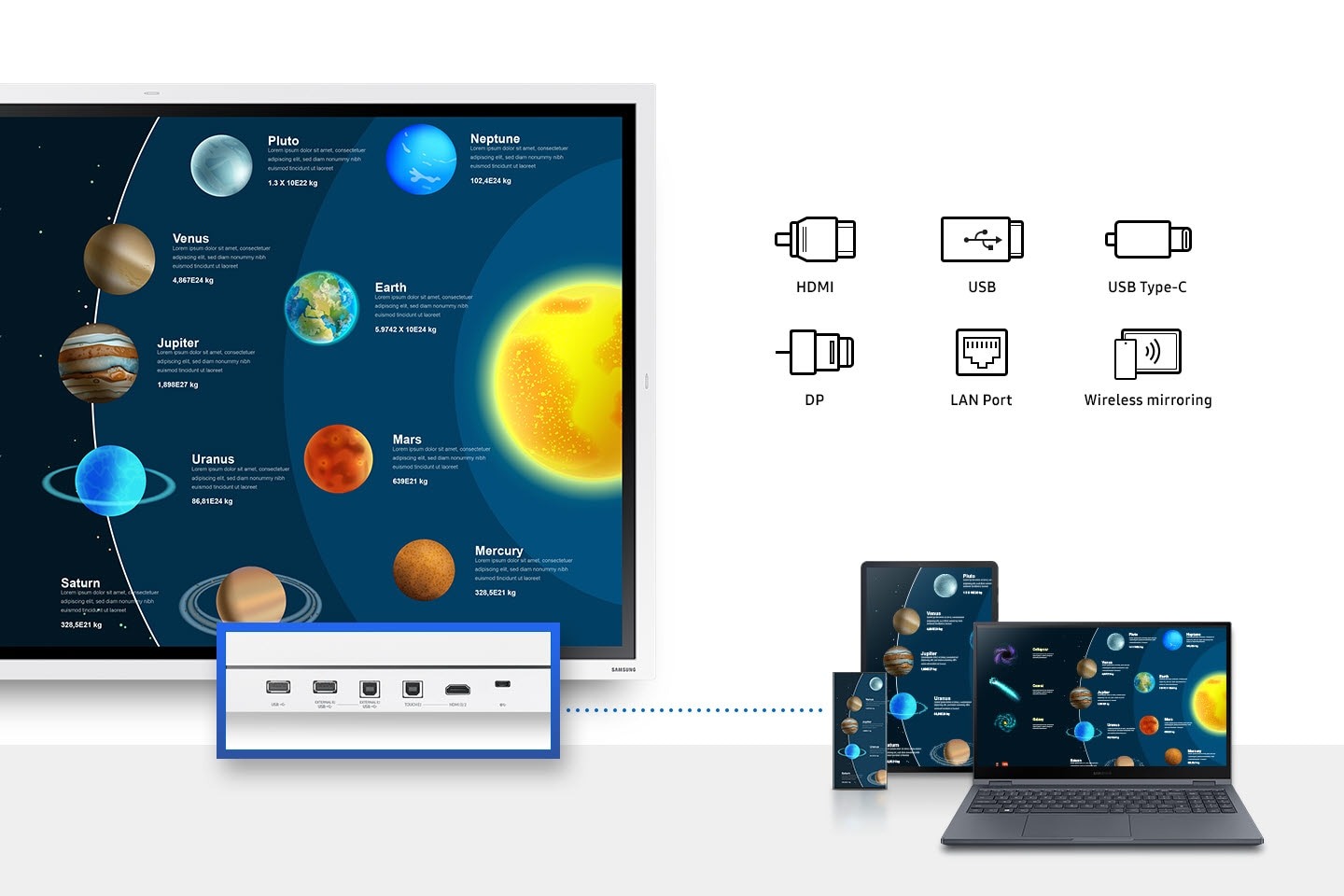 Bảng tương tác Samsung Flip Pro hỗ trợ nhiều cổng kết nối như USB, HDMI, DP và khe cắm OPS, tạo sự linh hoạt trong việc kết nối với các thiết bị bên ngoài. Điều này giúp giáo viên và người trình bày dễ dàng chia sẻ nội dung từ thiết bị cá nhân lên màn hình lớn, cũng như kết nối mạng và các thiết bị khác thông qua cổng LAN và phản chiếu không dây.
