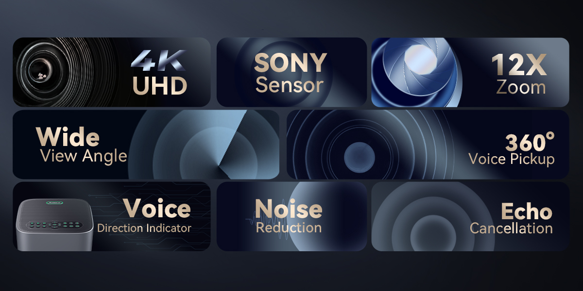 Hệ thống hội nghị truyền hình tất cả trong một Tenveo dành cho các phòng họp vừa và lớn. Bộ sản phẩm có giá thành hợp lý, bao gồm camera 4K với zoom quang 12X, loa ngoài thu âm 360° với bán kính thu âm lên đến 9 mét, mang đến trải nghiệm hội nghị trực tuyến chuyên nghiệp và rõ nét.