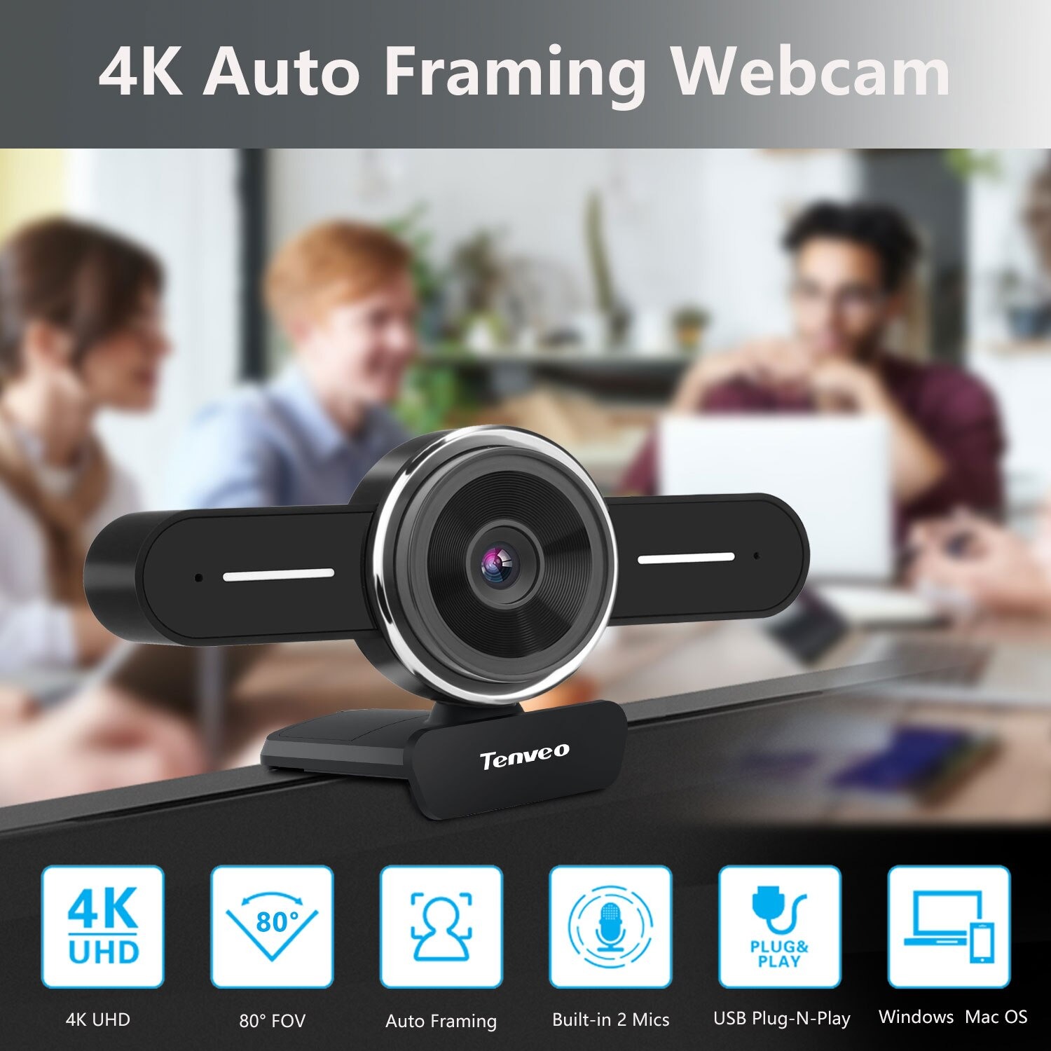 Webcam hội nghị tự động định khung 4K AI Camera web hội nghị với micrô đa hướng kép Góc nhìn trường góc rộng 80 độ cho các nhóm thu phóng