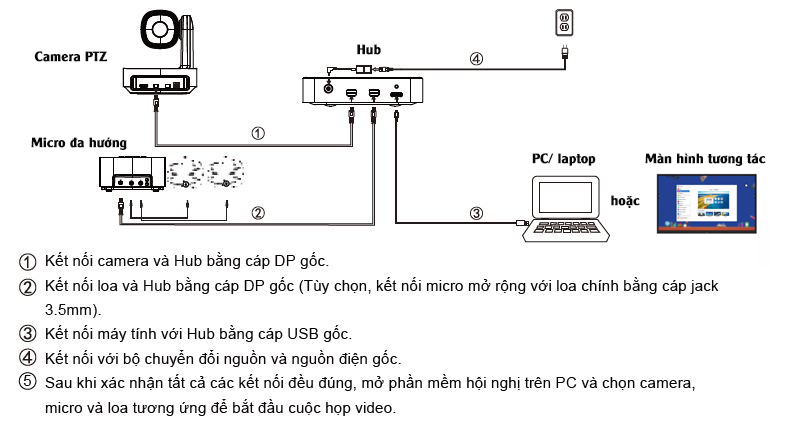 2. Kết nối loa và Hub bằng cáp DP gốc (Tùy chọn, kết nối micro mở rộng với loa chính bằng cáp jack 3.5mm).