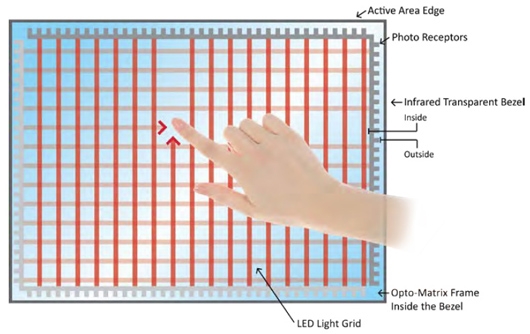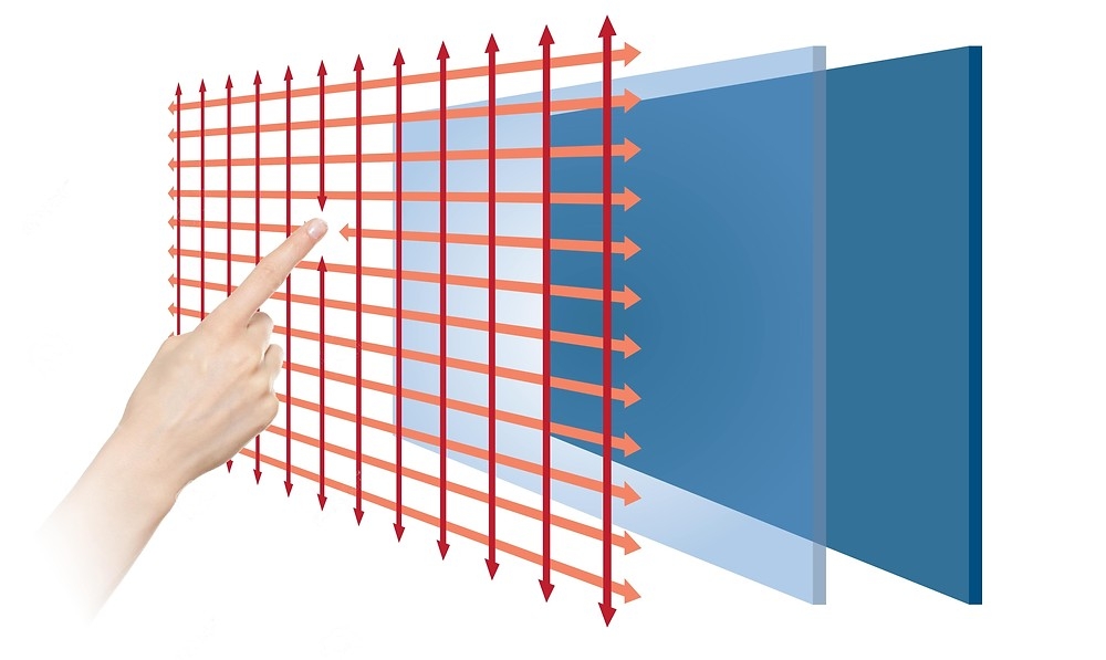 Màn hình cảm ứng là màn hình được phủ trên bề mặt bởi một tấm lưới tia hồng ngoại đan xen ngang dọc dày đặc lẫn nhau, nhận diện cảm ứng bằng cách xác định các tọa độ xảy ra ngắt quãng tia hồng ngoại trên tấm lưới này. Hiểu theo một cách đơn giản, màn hình sẽ được bao quanh bởi một chiếc khung viền chứa hàng loạt hệ thống đèn LED hồng ngoại (hay còn gọi là khung cảm ứng hoặc khung tương tác) chiếu ra các tia hồng ngoại mắt thường không thể nhìn thấy được với bố cục ngang dọc đan xen như một chiếc lưới. Khi người dùng chạm tay vào màn hình, các tia hồng ngoại sẽ bị ngắt quãng bởi ngón tay và dội ngược trở lại vào các cảm biến được bố trí xung quanh khung cảm ứng, từ đó phát hiện được toạ độ ngắt quãng và xác nhận vị trí cảm ứng.