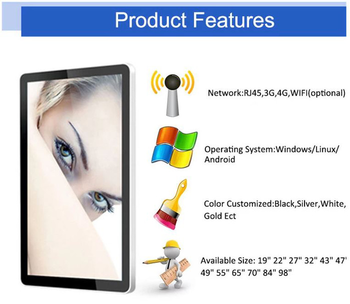 Màn hình quảng cáo treo tường cho phép hiển thị hình ảnh, âm thanh, video liên quan đến hình ảnh, sản phẩm của doanh nghiệp, nhằm thu hút và tạo ấn tượng đối với khách hàng.