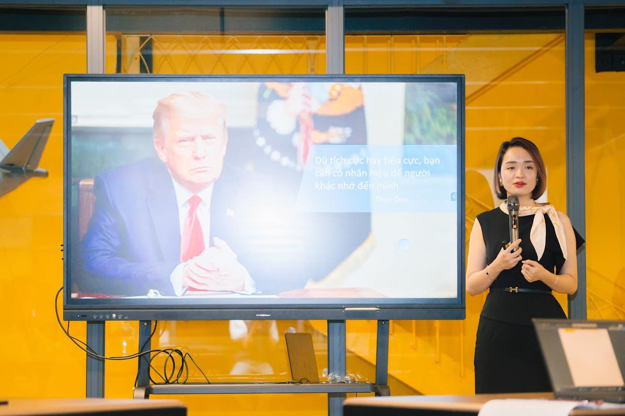 Tại các hội nghị, sự kiện, màn hình cảm ứng tương tác được dùng làm bảng điều khiển thông minh, trình chiếu lịch trình, kết nối với khách mời qua minigame, khảo sát, hoặc hiển thị nội dung theo thời gian thực để tăng trải nghiệm người tham dự.