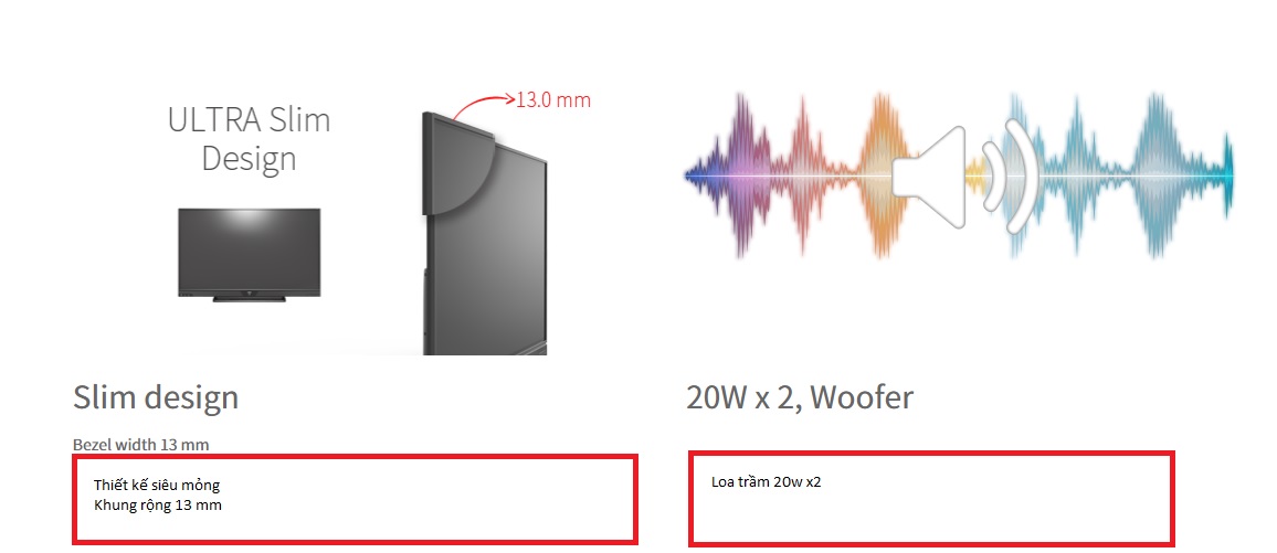 6. Thiết kế siêu mỏng khung rộng 13 mm. Có loa trầm 20w x 2
