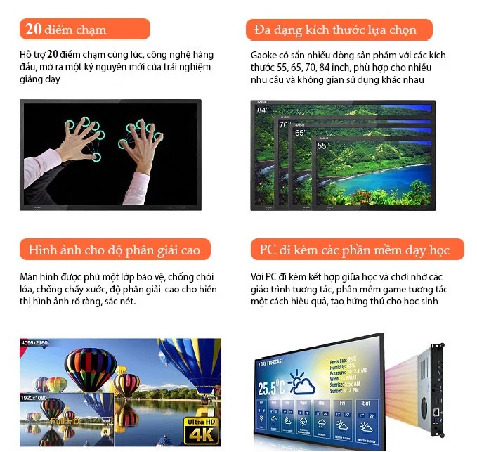 Màn hình tương tác Gaoke là một thiết bị all in one (tất cả trong một) là sự đồng bộ của các thiết bị trong một sản phẩm duy nhất: máy tính, bảng tương tác và máy chiếu, tivi kích thước lớn, wifi, loa…