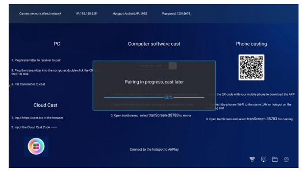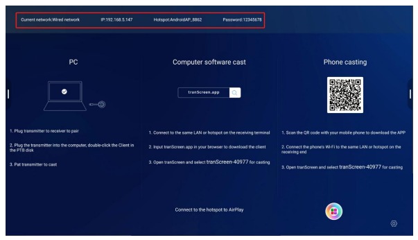 Giao diện chính: Trang chủ của thiết bị nhận sẽ hiển thị tên hotspot, mật khẩu hotspot, mã trình chiếu và các thông tin liên quan khác.