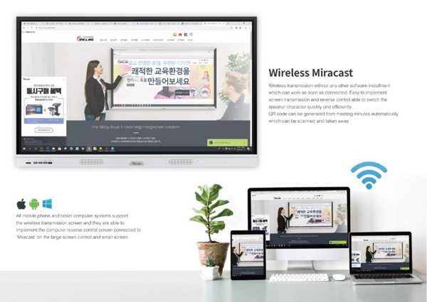 Màn hình tương tác lớn này có thể gắn trên tường cố định tạo sự an toàn khi sử dụng, và cũng có thể lựa chọn một chiếc chân đỡ màn hình tương tác có gắn bánh xe tạo sự linh hoạt như một màn hình điện thoại di động.