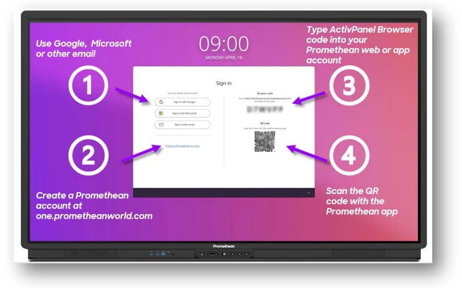 Bạn có thể tạo tài khoản Promethean bằng thông tin đăng nhập Microsoft hoặc Google, lưu thông tin trong tài khoản Promethean, khóa bảng điều khiển khi bạn chưa có nhu cầu sử dụng ngay.