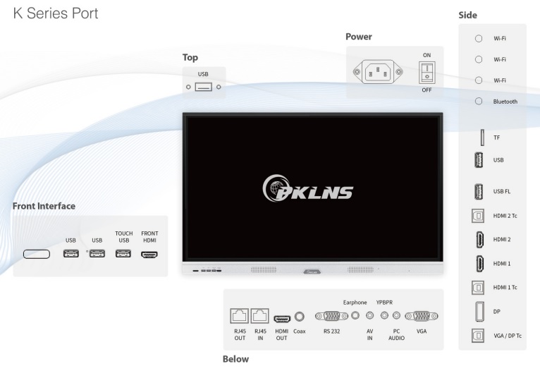 Dòng màn hình tương tác PKLNS K Series được tích hợp rất nhiều cổng kết nối: HDMI, USB,… hỗ trợ kết nối nhiều thiết bị, phụ kiện như mong muốn nhằm phục vụ tối đa nhu cầu của người dùng.