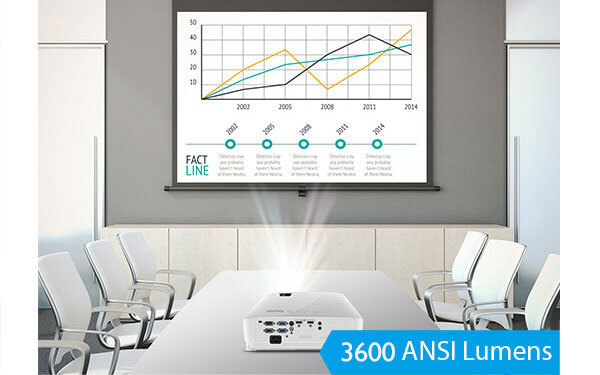 Độ sáng cao 3300 lumen cho phép trình chiếu thoải mái khi vẫn bật đèn, tạo điều kiện cho việc thảo luận, cộng tác và ghi chú trong các phòng họp nhỏ có đèn sáng với sức chứa lên đến 10 người. Độ sáng cao tăng cường chất lượng hình ảnh mang lại màu sắc rực rỡ cho hình ảnh và video cũng như hiển thị rõ nét văn bản và các chi tiết nhỏ.