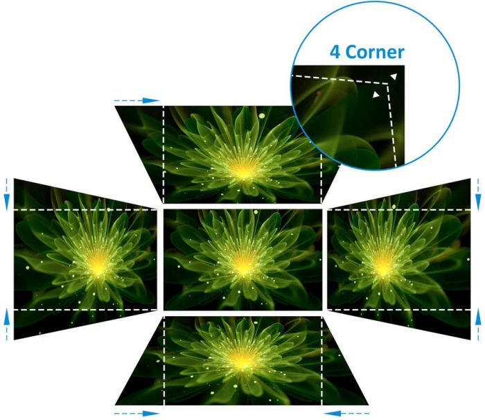 Keystone Correction trên máy chiếu GK-LS6000W cho phép điều chỉnh tất cả 4 góc của hình ảnh, chiều dọc lên tới +/- 30 độ ( thủ công/ tự động), ngang +/-15 độ ( thủ công) cho phép thiết lập khung hình vuông vắn 1 cách nhanh chóng, đơn giản, trong trường hợp hình ảnh tạo ra bị méo do ống kính máy chiếu không vuông góc với màn hình.