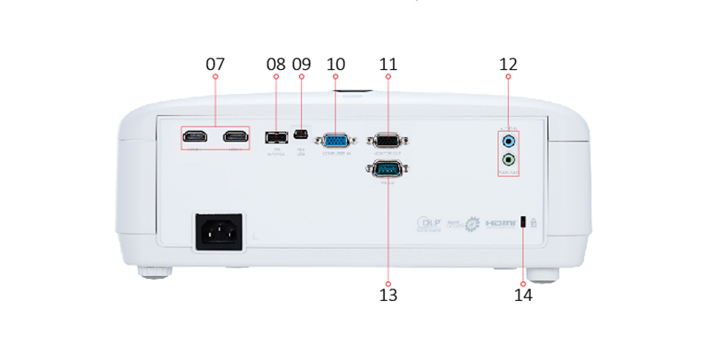 | 1. Nút nguồn kèm cảm biến hồng ngoại | 5. Zoom/ Focus | 9. Mini USB for service | 13. Cổng RS232 |