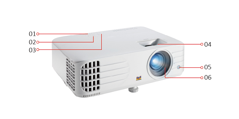 | 2. Đèn LED chỉ báo | 6.Ống kính máy chiếu | 10. Computer IN | |