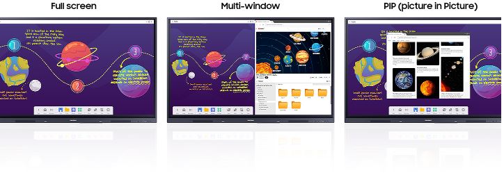 Một trong những tính năng nổi bật của Samsung WAD Android là khả năng hiển thị đồng thời nhiều màn hình. Tính năng này cho phép giáo viên có thể mở và hiển thị nhiều tài liệu, ứng dụng hoặc video cùng lúc, hỗ trợ tối đa cho quá trình giảng dạy. Sự đa nhiệm này giúp giáo viên linh hoạt hơn trong việc truyền đạt kiến thức và học sinh cũng dễ dàng theo dõi các nội dung liên quan.