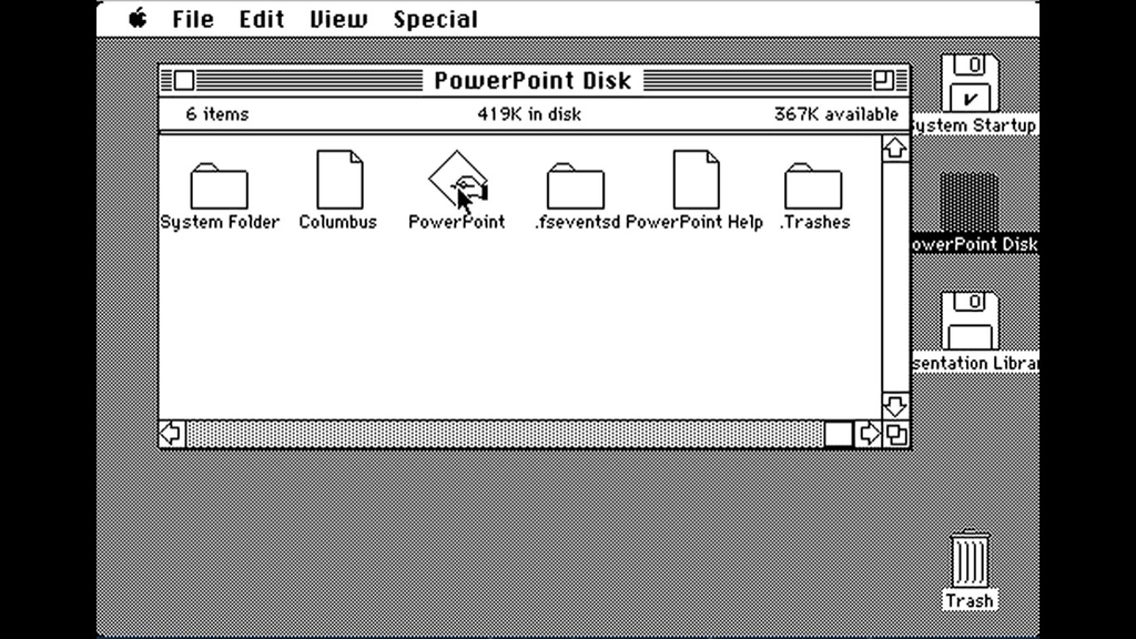 Khi công nghệ trở nên tiên tiến, sự phát triển của các bài thuyết trình cũng vậy. Các nhà thiết kế slide đã chuyển từ việc tạo slide bằng tay sang tạo chúng trên máy tính với các chương trình thiết kế ban đầu. Năm 1987, khi PowerPoint được phát hành, các nhà thiết kế slide đã nhanh chóng bắt tay vào tìm hiểu chương trình và hoàn thành bài thuyết trình nhanh hơn. Phong cách thiết kế của các bản trình bày đầu tiên được tạo trong PowerPoint bị giới hạn bởi những gì PowerPoint cung cấp. Phiên bản PowerPoint đầu tiên được ra mắt cho máy tính Apple với hai màu đen và trắng.