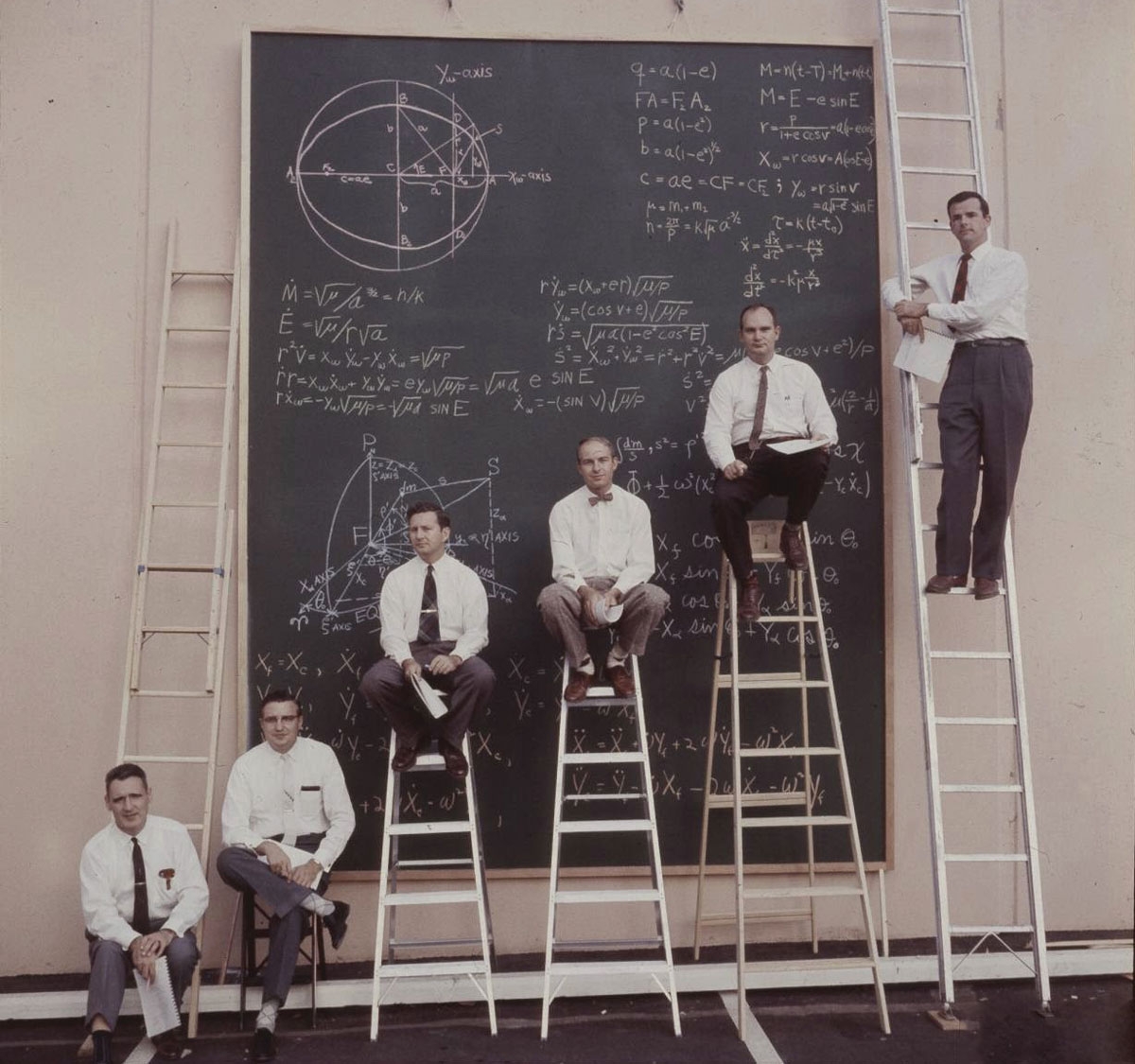 Bên cạnh đây là hình ảnh một nhóm các nhà khoa học của NASA được chụp vào năm 1961 mô tả về cách họ nghiên cứu về các phép toán liên quan đến việc khám phá không gian.