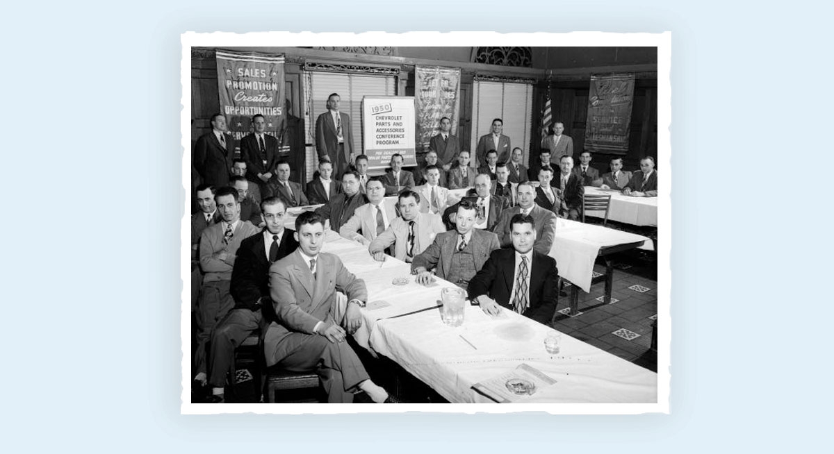 Hình ảnh dưới đây cho thấy một ví dụ thú vị khác về cách người ta thuyết trình bằng bảng flipchart được sử dụng trong Cuộc họp kinh doanh của Chevrolet vào những năm 1950.