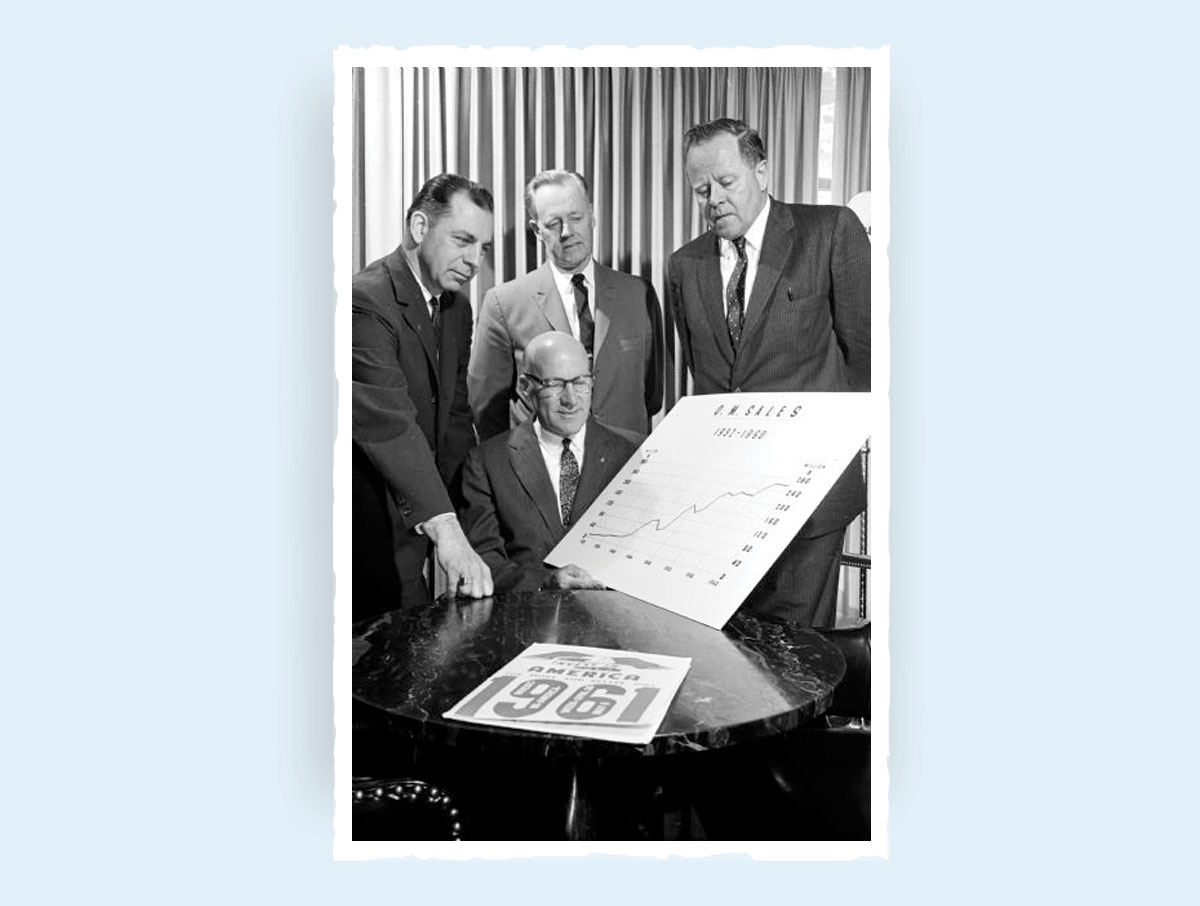 Một ví dụ khác, đây là bức ảnh chụp tại cuộc họp bán hàng của Công ty Oscar Meyer. Hãy để ý cách những người đàn ông đang cầm một tấm poster có biểu đồ dữ liệu bán hàng và đưa nó cho ông Oscar Meyer.