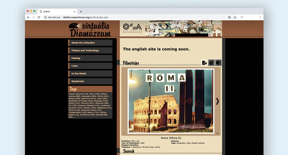 Trang web của Hungary dưới đây có một bộ sưu tập tuyệt vời về phim cuộn và slide có niên đại từ những năm 1920 đến những năm 1980.Nhiều slide trong bộ sưu tập này có thiết kế tương tự; thành phần rất đơn giản bao gồm hình ảnh và văn bản. Trong một số trường hợp, các thiết kế phức tạp hơn một chút. Nhưng phần lớn, chúng có vẻ mang tính giáo dục hơn là sáng tạo.